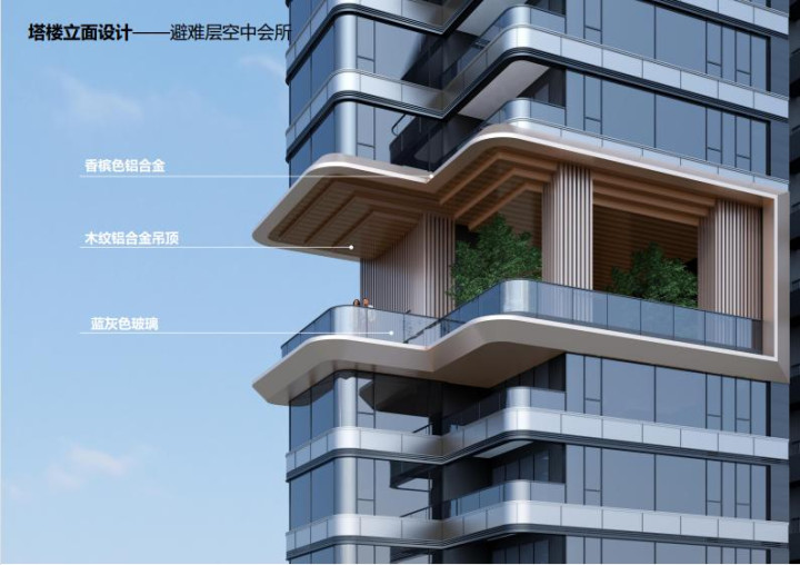 每栋楼双空中会所设计,以香槟色铝合金勾勒现代线条,木纹铝合金吊顶传递自然温度,蓝灰色玻璃铺就通透视野,三者交织出业主独享的“云端栖息地”。