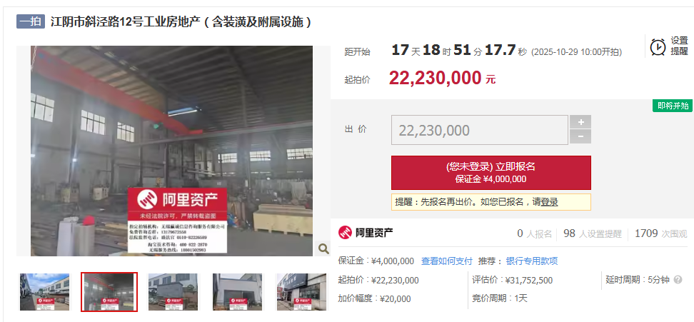 根据江阴市人民法院发布的(2025)苏0281执2203号公告,该标的物评估价为3175.25万元,本次起拍价为2223万元。标的物所有人为江阴市安利达轮胎有限公司,其房产及土地分别存在中国农业银行股份有限公司江阴分行与江阴市红柳被单厂有限公司的抵押与查封。